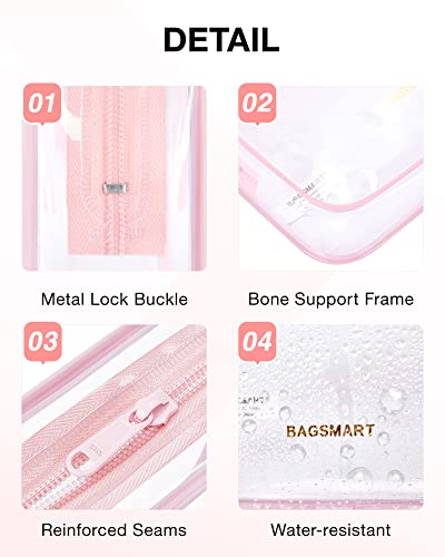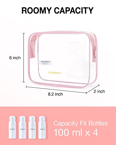 BAGSMART Clear Toiletry Bag, 2 Packs TSA Approved Water resistant Quart Size Travel Organizer, Airport Airline Travel Essential Carry On Makeup Cosmetic Bags for Women, Pink