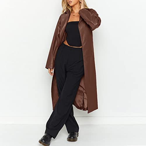 chouyatou Women’s Casual Lapel Open Front Pu Faux Leather Long Trench Coat with Belt