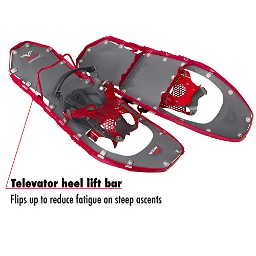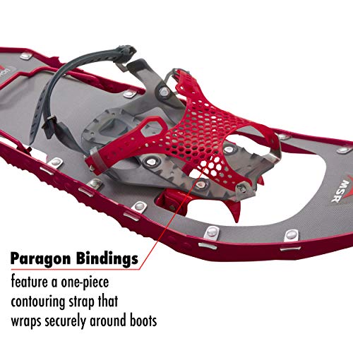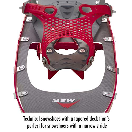 The MSR Lightning Ascent Women’s Snowshoes are the lightest, most aggressive snowshoes in the MSR line, designed for backcountry pursuits. Engineered to address the biomechanics of women, they are also suitable for anyone with a narrower gait seeking an ultralight option with maximum maneuverability and agility. Minimalist Paragon bindings feature a one-piece mesh contouring strap that wraps securely around boots for a glove-like feel that eliminates pressure points and promotes alignment and foot control. The ultra-durable, variable-thickness TPU mesh conforms to a wide range of boots, and maintains strength and flexibility in frigid weather; bindings are field-maintainable. A 360-degree traction frame offers edge-to-edge grip, and steel DTX crampons provide bite on slopes. Rugged, lightweight polyurethane decking offers floatation and durability, and easy-to-engage Ergo Televator heel lifts offer help on the steeps, reducing fatigue. Available in two sizes to accommodate a range of body weights and gear loads: 22-inch snowshoes measure 7.25×22 inches, weigh 3.88 pounds/pair, and can carry a 180-pound load; 25-inch snowshoes measure 7.25×25 inches, weigh 4.04 pounds/pair, and can carry up to 220-pounds. Bindings fit women’s shoe sizes 4.5-14. Sold as a pair. Made in the USA. Three-year limited warranty.