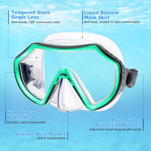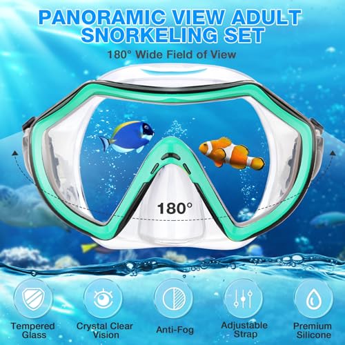 【 Crystal Clear Panoramic Vision 】This snorkel goggles features anti-fog single lens designed for snorkeling. Compared with the double lens, the field of view is increased by 20%. The 180° panoramic view made you to see better around you without too much effort. You’ll have maximum under-water visibility and a crystal clear underwater experience.