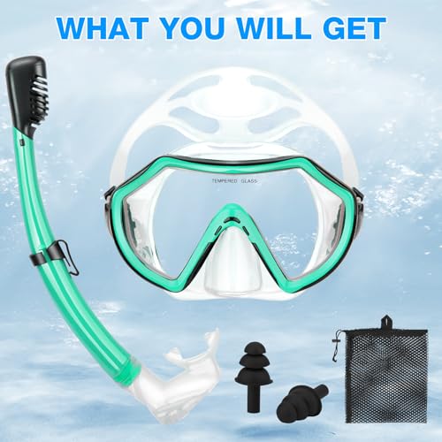 Specification: PIYAZI Snorkeling Gear for Adults, Dry Adult Snorkel Set HD Panoramic View Snorkel Mask Set, Anti-Leak and Anti-Fog Scuba Diving Package with Mesh Bag Ear Plug for Snorkeling Scuba Diving Travel