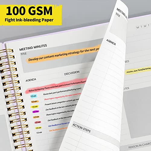 SUNEE Meeting Notebook for Work with Action Items – 160 Pages, A4 Size Project Planner, Spiral Meeting Agenda/Minutes Notebook Organizer for Women Men, Note Taking, Office & Business, 8.5″x11″, Purple