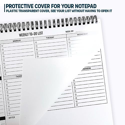 Spiral Bound with Protective Cover: Flip through your to-do list with ease thanks to our twin spiral-bound notepad, allowing you to start a new page while keeping old ones for reference. Want to remove your lists when you’re done? No problem! You can tear them out as needed. Our notepad also features a protective plastic cover that keeps your pages safe from spills, scratches, and tears when you’re on the go. Even better, the cover is transparent so you can see your to-do list page at a glance as you’re going throughout your day.